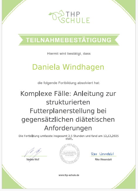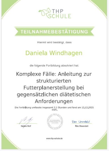 Von der zertifizierten Tierernährungsberatung über Mykotherapie bis hin zu speziellem Wissen bei Erkrankungen – jedes einzelne Zertifikat steht für mein Engagement, dein Tier bestmöglich zu unterstützen.